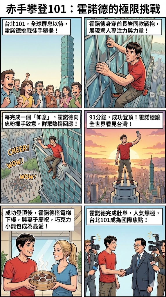 美國攀岩大神艾力克斯·霍諾德(Alex Honnold)挑戰徒手攀登台北101,僅用91分鐘完成壯舉,震撼全球。他的勇氣與專注不僅展現了攀岩的極限,也讓台北101成為國際焦點。從攀爬過程到成功登頂,再到享受台灣美食,霍諾德的故事充滿了力量與韌性。